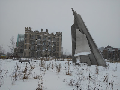 Much of the west side of the property is taken up with the Landscapes Of Canada Gardens, featuring plants from four ecosystems along a pathway. I like to document the Gardens in each season, even winter, when the plants are buried beneath the snow. This time my path started by the family of mammoths, sculptures that stand at the Mammoth Steppe. The plants here include ones that would have been present when the animals were at their height.