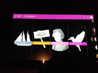 A display case nearby contains a number of Canadian coins. Each are accompanied by an alpha numeric code.