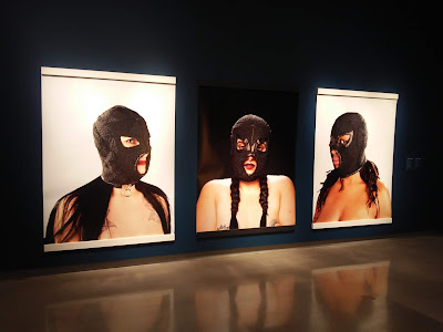And then there's something very different. Dayna Danger is an artist whose background includes Indigenous family. Large photographs of three women, including herself at the centre, wearing BDSM masks, are featured. The masks themselves are exhibited close by, a mix of leather and bead embroidery, more elaborate than the usual one would see out of BDSM. This reflects Cahun and Moore's perspective on the interest at the time among fellow surrealists about BDSM.