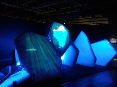 Yesterday I mentioned that the Museum of Nature organizes its galleries thematically. When I visit, I like to go to the top floor and work my way down. There's one gallery up here for temporary exhibits, which I didn't visit this time out. The other gallery is the Arctic Gallery, a collaborative effort with the First Nations of the Far North, showing life and landscapes of the Arctic. The first thing one sees upon coming inside are a set of slabs of ice. The water melting off of these during the day is frozen back onto the surfaces at night. Film images of people, animals, and the land of the north are projected onto these slabs.