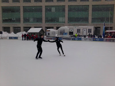 City Hall has a large skate rink outside suitable for skating after the Canal skate season comes to an end. During Winterlude one often sees skating demonstrations. These two were members of a local figure skating club.