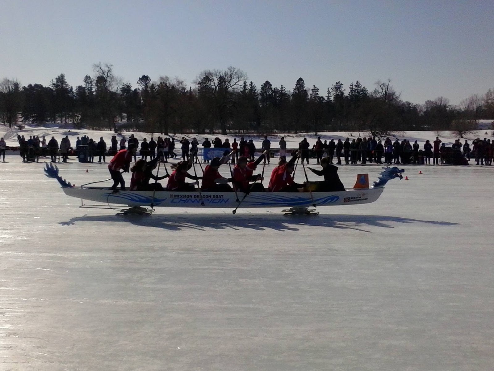 I've seen the summer version as well. This looks harder. The dragon boats are placed onto an apparatus with parallel skate blades. The rowers aren't using oars, but sticks to propel themselves along the ice. It's quite something to see in person.