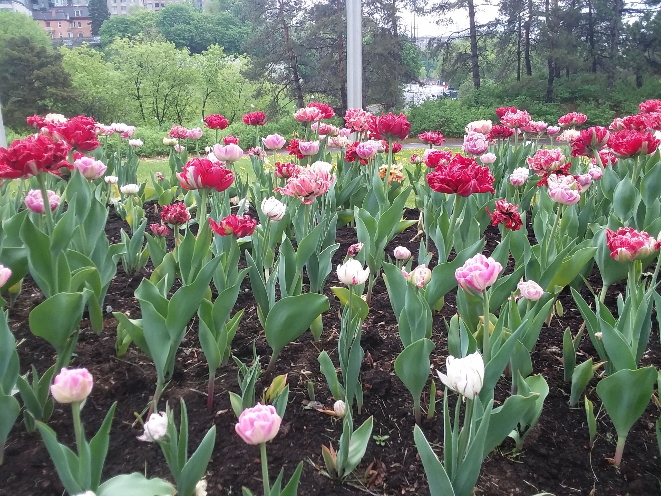 Down below the terraces are flowerbeds, mostly with varied plants, but a scattering of tulips among them that are likely left in the ground as opposed to dug up as is the case elsewhere. Christ Church Cathedral stands in the background.