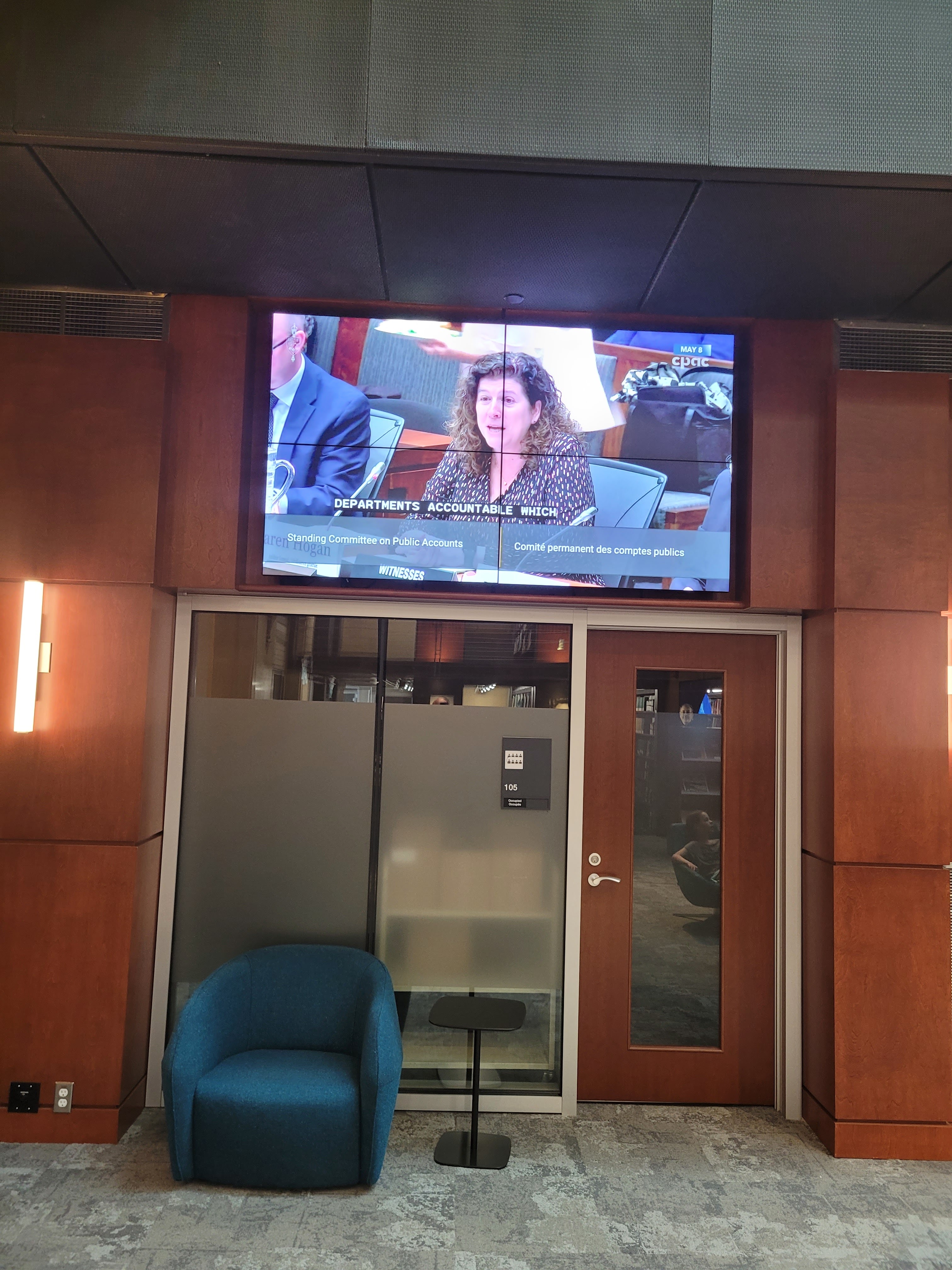 Canada has a tradition of poet laureates. In this building, past and present holders of that office have a copy of one of their poems displayed along the stacks on the main floor.