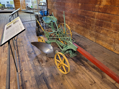 DeleteThat little tractor looks more appropriate for gardening than farming. I see the horse drawn plow painted in John Deere colors. Love your last photo showing the beam construction of the barn.