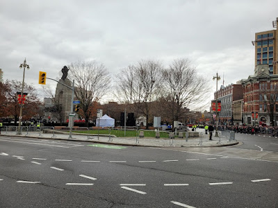 On Remembrance Day, I came up to attend the national services at the War Memorial. I tend to prefer an area at the northwest corner of Confederation Square, and arrived early enough to get a spot by the barricades. I took this shot beforehand.