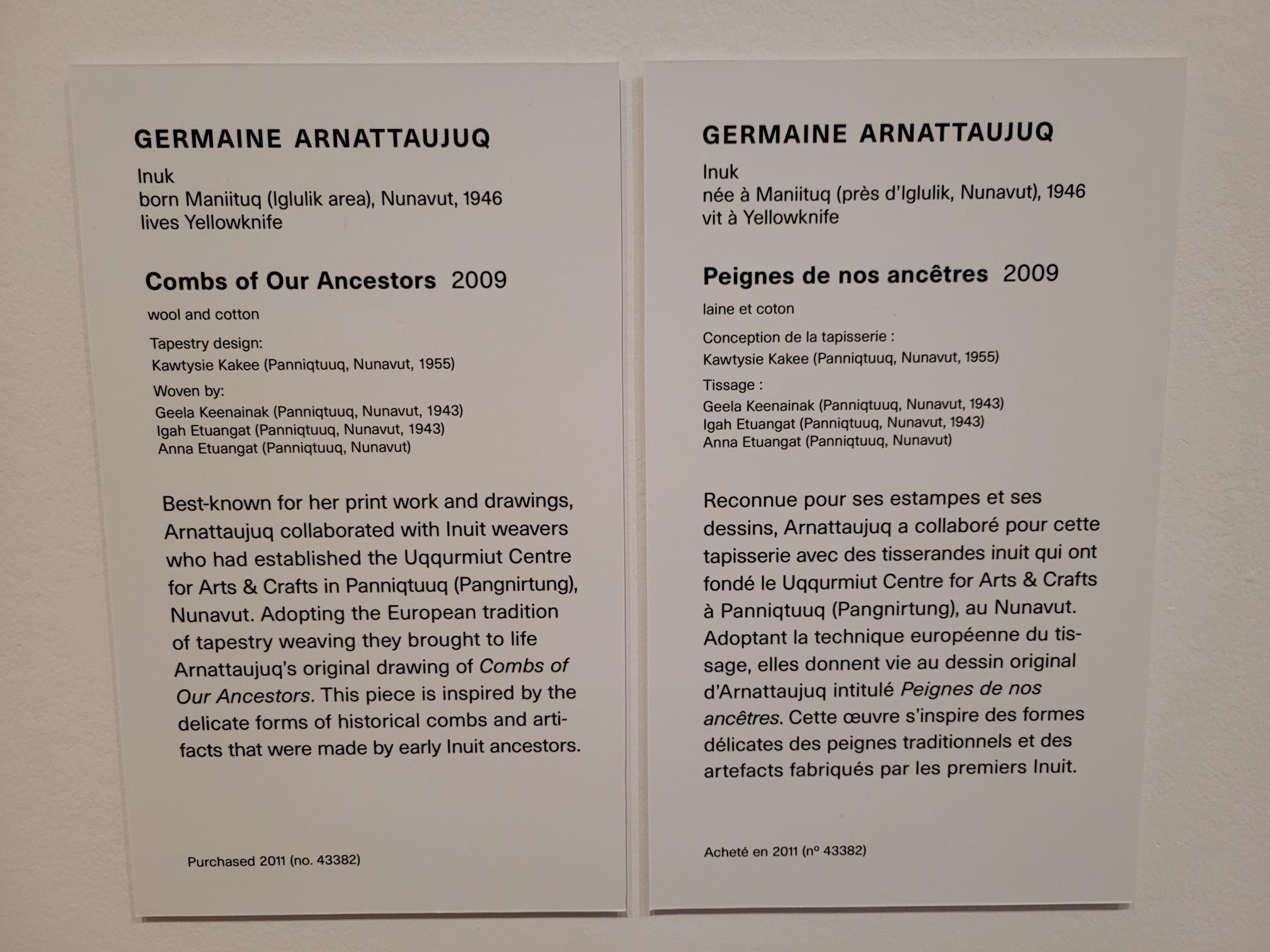 On this wall, a display case at right includes old Inuit combs. At left, a response to them- Combs Of Our Ancestors is a 2009 woven tapestry by Germaine Arnattaujuq, in collaboration with weavers in Nunavut.